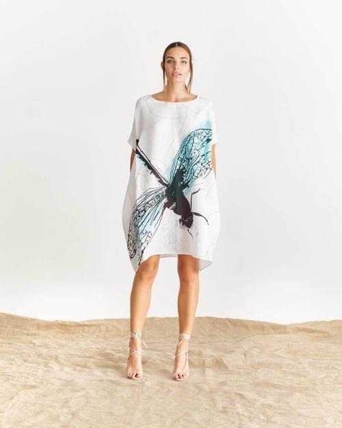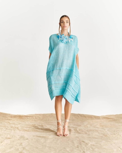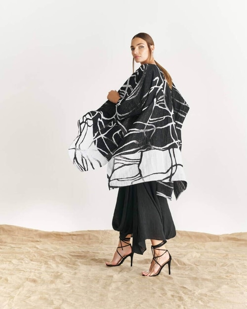 The collection is visually striking with pieces in magenta pink, orange and turquoise in linen and soft cotton. Another group that stands out, boasting strong contrast in black and white designs, completes the collection. Influenced by the timeless beauty of Japanese traditional clothing, the designs are architecturally shaped and easy to wear.
