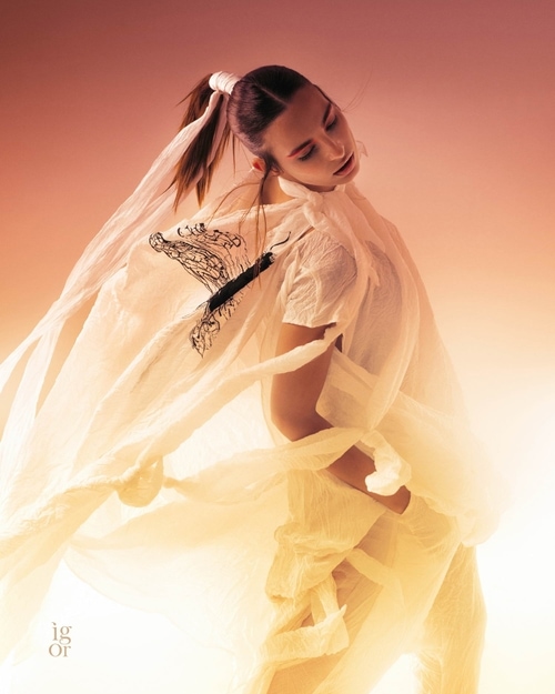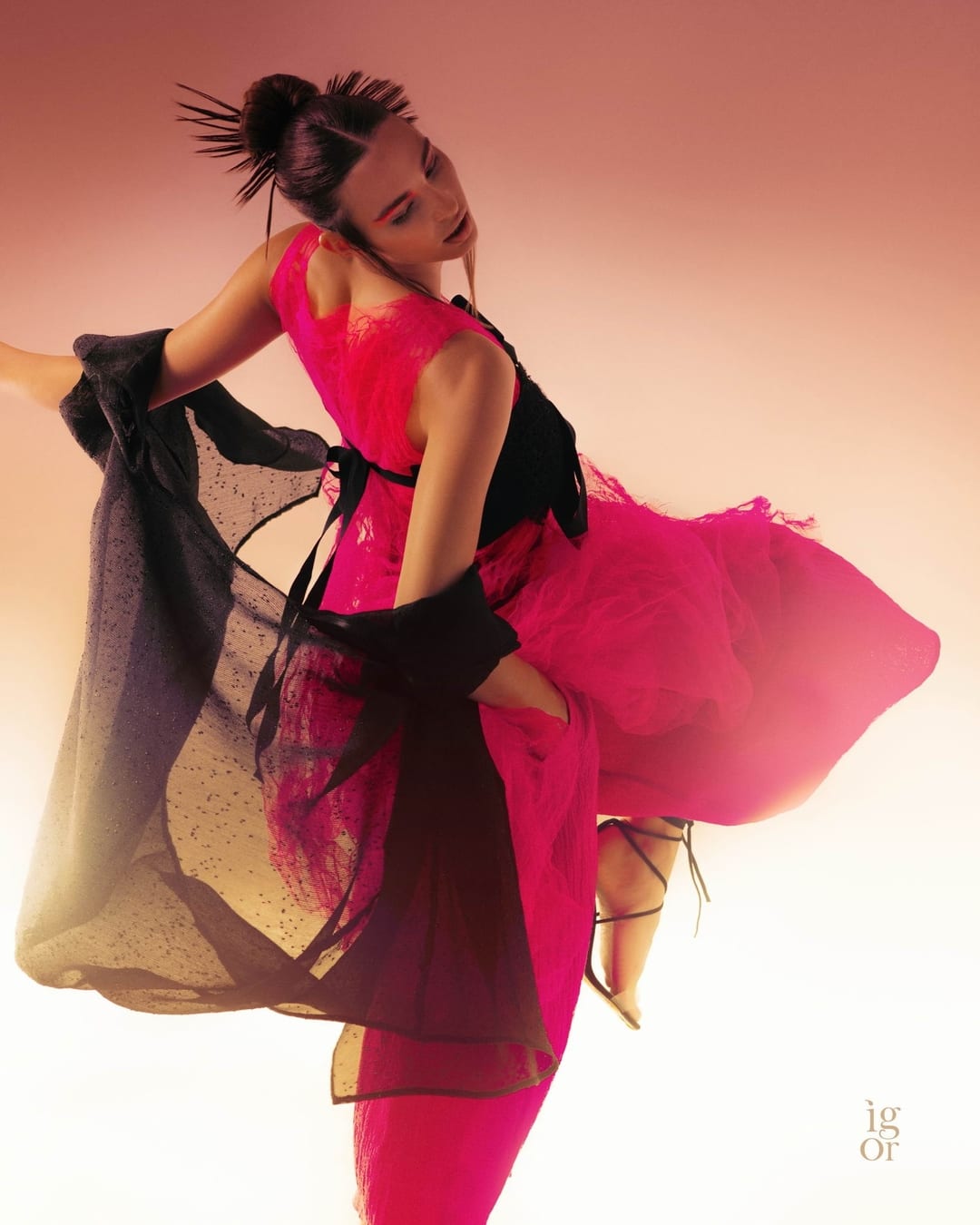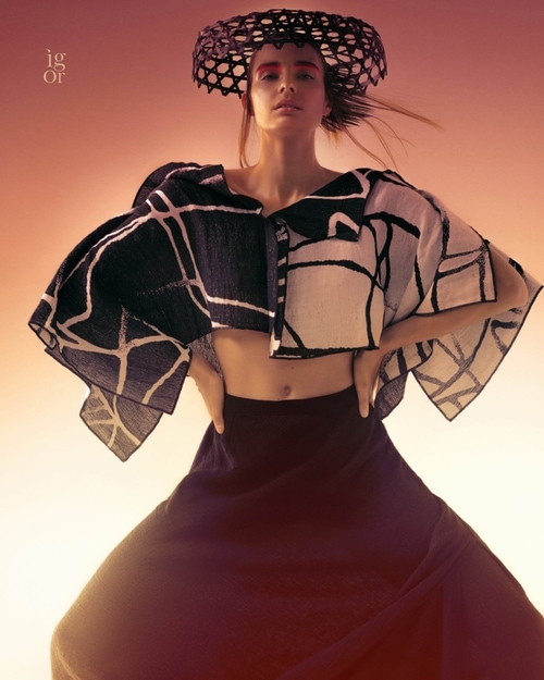 The collection is visually striking with pieces in magenta pink, orange and turquoise in linen and soft cotton. Another group that stands out, boasting strong contrast in black and white designs, completes the collection. Influenced by the timeless beauty of Japanese traditional clothing, the designs are architecturally shaped and easy to wear. IGOR used the dragon fly, a delicate symbol of nature - the designer’s eternal inspiration, as he says - to adorn his Spring/Summer 2019 collection, designed by textile artist Ivana Zanko and interpreted through graphic screen prints, ink jet textile print, and embroidered jet beads with feather details on textiles and plexiglass.